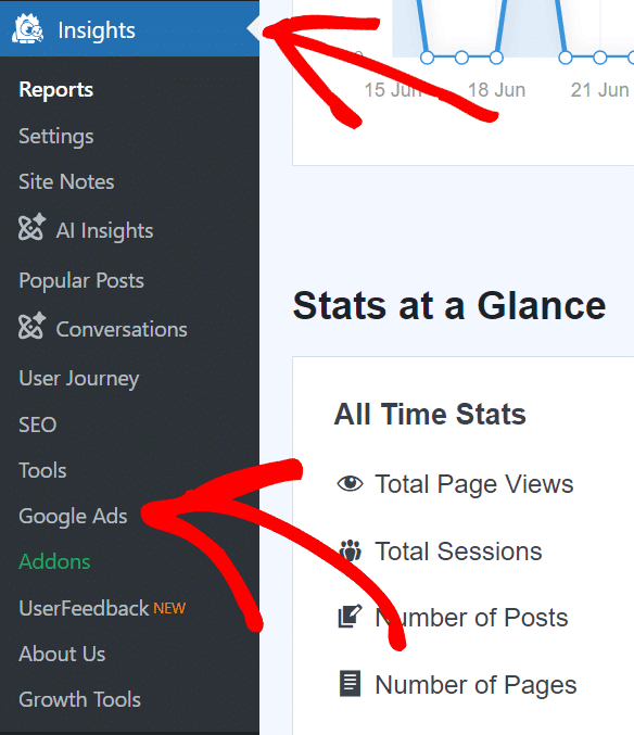 Log into your website’s admin area and click Insights in the sidebar. Then, under Insights, click Google Ads.