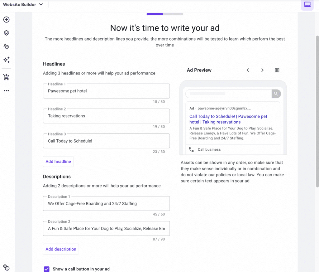 Write your ad content. Then preview and adjust headlines, descriptions, and optionally add a call button. Click next when finished.