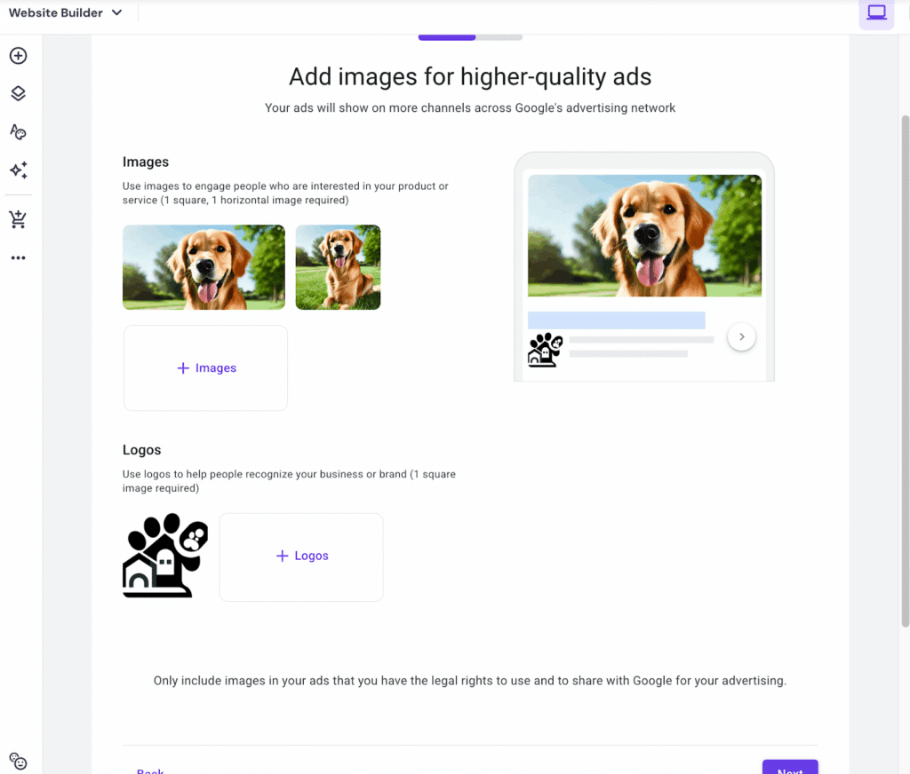 Upload your ad image. You need at least one square (1:1), one horizontal (4:5), and one logo image for display within the ad. Click next after uploading.