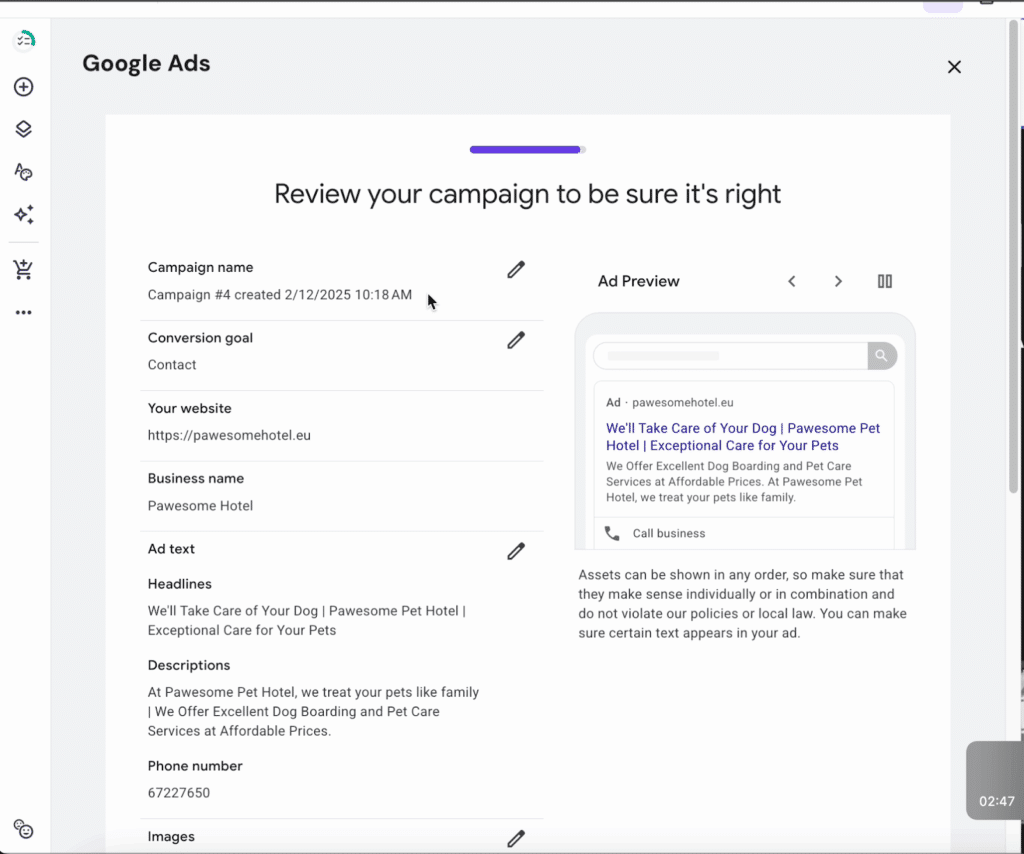 Review all entered setup details and the ad preview (visible in the right pane) for accuracy. Edit any necessary changes by clicking the pencil icon next to the item. Click next when satisfied.