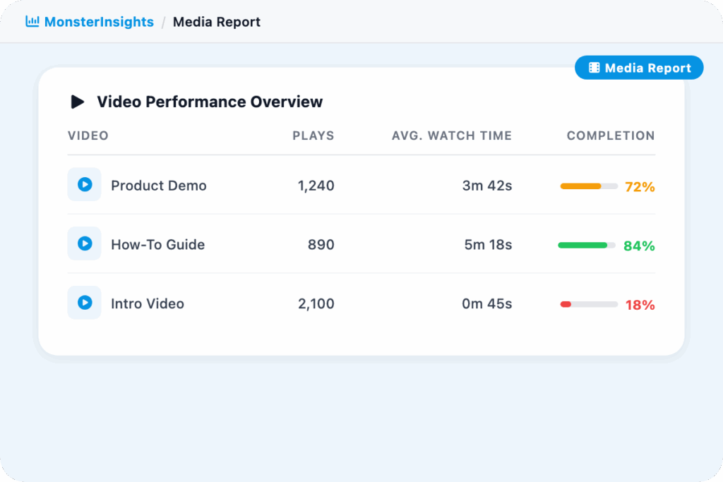 MonsterInsights tracks video plays, watch time, and completions for every video on your site. In your Media Report (Insights > Reports > Media) you see total plays, average watch time, average percentage watched, and completion rate per video. The same data is also sent to Google Analytics as events under Engagement > Events.