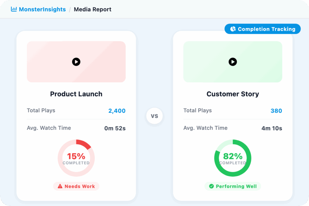 MonsterInsights shows you both plays and completion rate for every video, so you can diagnose the right problem and fix the right thing instead of guessing.