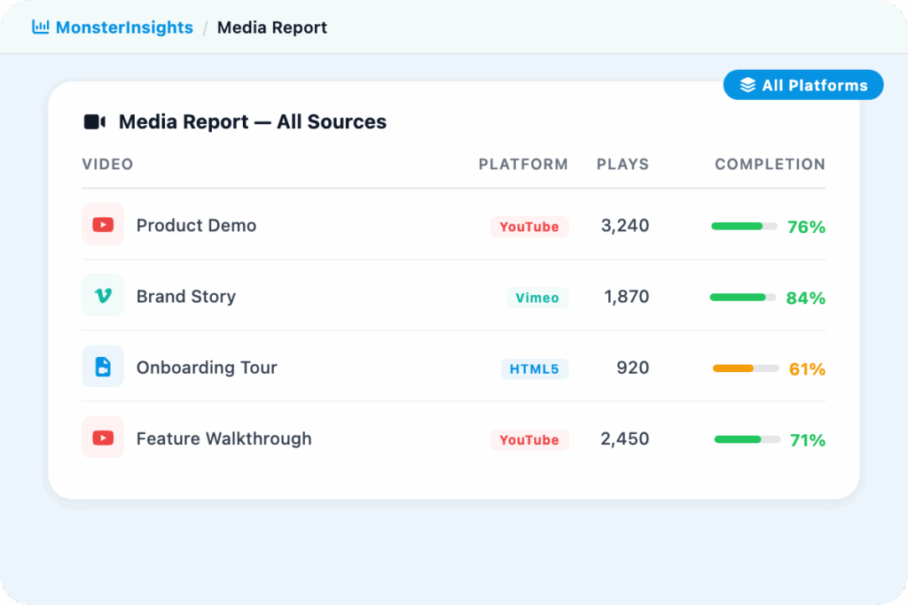 Whether you embed YouTube videos, host content on Vimeo, or upload HTML5 videos directly to WordPress – MonsterInsights tracks all three automatically in the same report. No separate tools, no platform-by-platform setup.