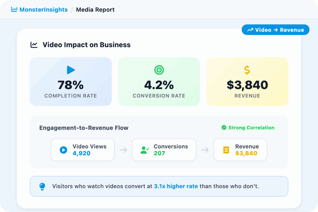 MonsterInsights helps you see which pages with embedded videos perform best, whether video completion correlates with purchases or form submissions, and where video content is actually moving the needle for your business.