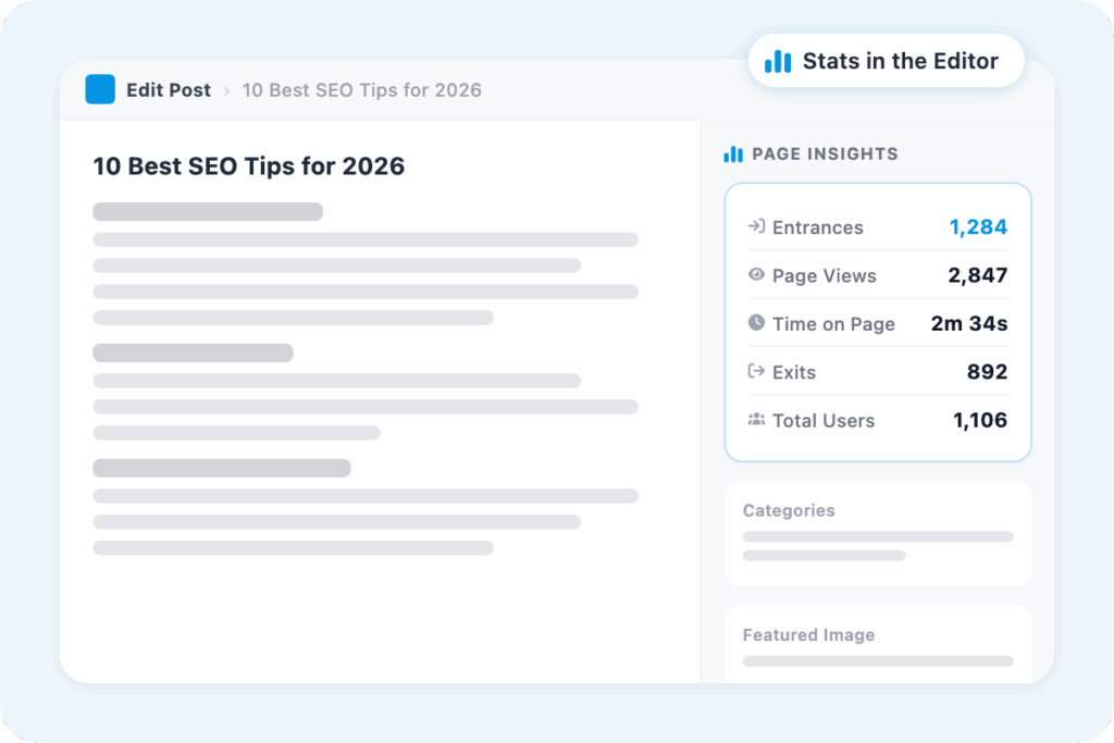 MonsterInsights shows you pageviews, time on page, bounce rate, entrances, and more for every post and page – right inside the WordPress editor. No GA4 login. No tab switching. Just the data you need, where you actually work.