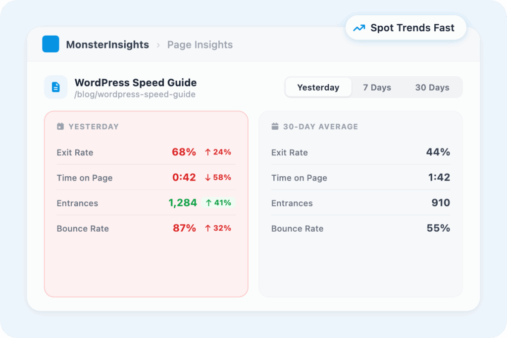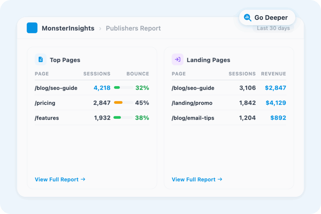 Page Insights is your starting point. When you notice something worth investigating – a page with unusually high entrances, or a landing page with low average time on page – MonsterInsights has the reports to dig deeper.