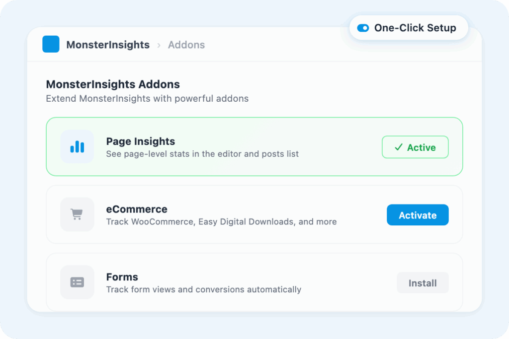 Page Insights is available on MonsterInsights Plus plans and higher. Once you have an eligible plan, you can install and activate the Page Insights addon from the Addons screen inside WordPress – no extra configuration required.
