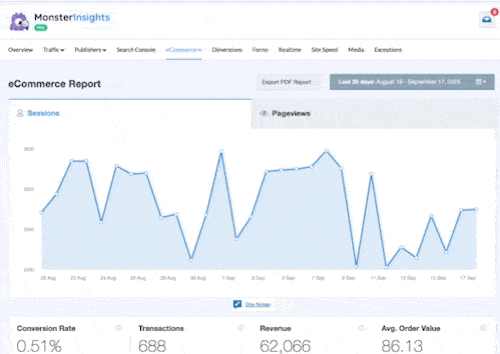 MonsterInsights is the clear choice for WooCommerce stores. Its automatic enhanced eCommerce tracking captures conversion rate, revenue, average order value, product performance, and channel attribution without any custom code. Independent Analytics offers basic WooCommerce revenue data in its Pro version, but it doesn’t come close to the depth of eCommerce insight MonsterInsights provides.